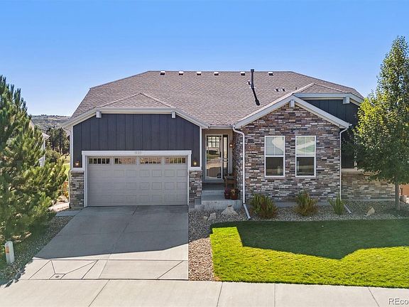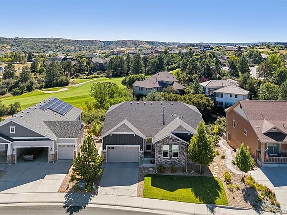 Serene living overlooking Plum Creek Golf Course and spectacular views! This 4-bedroom, 4-bathroom, Ranch with walkout basement offers an array of beauty and updates, including a one-of-a-kind backyard experience. Enjoy the sweet serenity whether on the custom designed patio off of the basement walk-out or the covered deck off the main floor. The main level features beautifully stained wood floors throughout the open-concept space and a cozy fireplace with custom mantle and stone laid to the ceiling in the living area. You will enjoy cooking and entertaining in the gourmet kitchen with builder upgraded cabinets, quarts countertops, walk-in pantry, stainless steel appliances, over-sized island with farmhouse sink all open to the main living room and dining area. The spacious primary bedroom features French doors out to the builder extended back deck. A beautiful cherry finish barn door leads to the primary bathroom including dual undermount sinks, quartz counters, high end tile throughout and an ample walk-in closet. A guest bedroom, powder, laundry room, full bathroom and French doors leading to an office (could be another bedroom) round out the main floor. All main floor doors are 8' and bath surround tiles extend to the ceiling. The walk-out open basement area is perfect for entertaining, with custom built shelving/entertainment center and lighted display case surrounding the perimeter. Also custom built is a corner desk area with a ton of shelves and under mount lighting. The back patio includes a cozy firepit and semi enclosed BBQ with natural gas hookups. An underdeck drainage and lighting system was added for increased comfort. Another great feature you will love is over 1000 sq ft of storage space including heavy duty Kobalt racks. Historic Downtown Castle Rock shopping, dining, and recreation are only a short walk away! This home is a dream come true. Someone's going to be very happy here... let it be you!