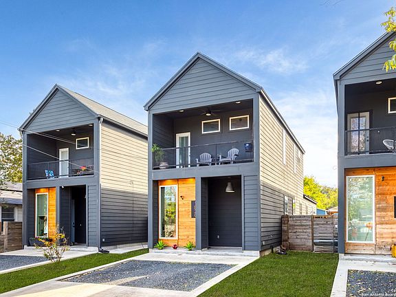 Welcome to this exquisite modern home just east of downtown San Antonio. Blending contemporary design with the vibrant charm of the city, this residence offers the perfect balance of urban living and modern luxury. Step inside to an open floor plan with soaring ceilings that create a sense of spaciousness. Monochromatic cabinets, counters, and walls allow the engineered hardwood floors and accent fixtures to stand out beautifully. The kitchen features a breakfast bar, stainless steel appliances, gas cooking, soft-close cabinets, and stylish open shelving-perfect for displaying your favorite pieces. The first floor includes a full bathroom with a tub/shower combo, a versatile second bedroom that can also serve as a home office or gym, a laundry closet with space for full-size front loaders, and an additional storage closet under the stairs. Upstairs, you'll find the oversized primary suite, complete with a walk-in closet and full bathroom. One of the home's standout features is the covered balcony, which offers a peaceful retreat surrounded by an abundance of mature trees in all directions. The backyard is designed for both relaxation and entertaining, with a shadow rock pathway, large paver patio, and cozy space that's perfect for dinner parties or a dog to enjoy the sunshine. This stretch of Crockett Street offers a unique sense of privacy, as homes here face the backyards of Canton Street rather than other facades, creating a more secluded and tranquil feel. Located in Jefferson Heights, bordering Dignowity Hill and Denver Heights, this neighborhood is rapidly growing with new development and revitalization. Enjoy quick access to Downtown San Antonio, the Pearl Brewery, Fort Sam Houston, St. Paul Square, Willow Springs Golf Course, Salado Creek, the Frost (AT&T) Center, Alamodome, major highways, fantastic dining, shopping, and more. Experience the best of modern living just minutes from the heart of the city. (Grass digitally enhanced to show potential.)