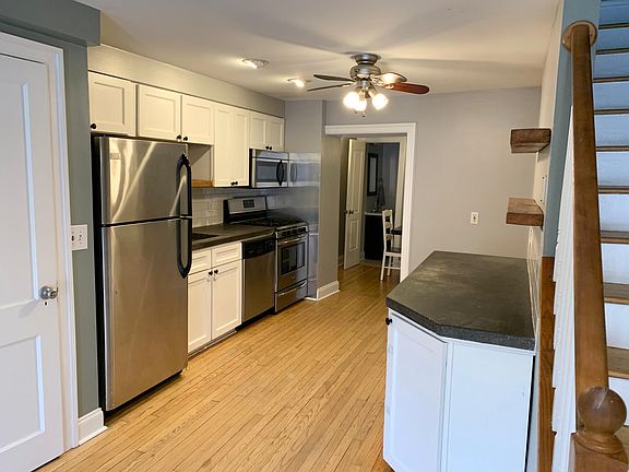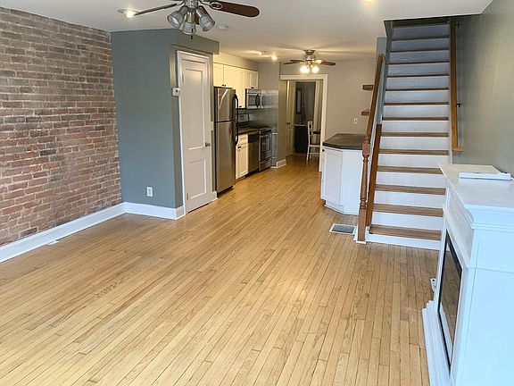 City charm at its finest with this three-bedroom home with a finished basement in South Baltimore/Federal Hill! The home features reclaimed hardwood floors, exposed brick, reclaimed wood shelves, a built-in desk made of an old beam from the house, a custom dining set made of reclaimed wood, concrete countertops, stainless steel appliances, subway tile, tons of storage, and more. The first floor has a large living room with an electric fireplace; a high-end kitchen with a pantry; a custom dining room; a full bathroom; and a mudroom with shelving and a coat rack. The basement has hardwood floors, lots of natural light with two windows, a chalkboard wall, a built-in desk, and a laundry and storage room. The second floor has a large bedroom with three closets, new carpet, and a built-in cabinet for a television; a small bedroom with hardwood floors and a closet; a full bathroom with a tub; and a master suite with 12' ceilings, three closets, new carpet, and a full bathroom with a tub. Take an indoor stairwell to a large third-story rooftop deck that features skyline views, composite decking, a TV mount and cable line for a television, shade sails, string lighting, and extra rails for kids' safety. The back of the house features a one-car garage that fits a medium SUV or smaller, and shelving. This house is two blocks from Riverside Park, a 10-minute walk to Cross St., three blocks from Port Covington, and steps from Hersh's and HomeSlyce. There is plenty of non-permitted street parking on adjacent blocks. Available April 1st. Renter pays utilities and water bills.