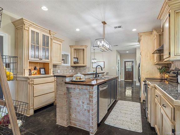 Absolutely stunning, custom built home in the heart of Carlyss. Featuring over 3100 sqft. and sitting on over 1 acre of property, you don't want to miss out on this one! This home is a 4 bedroom, 2.5 bath with lots of storage and custom features all within. On the interior, you can find a tasteful kitchen with a walk-in pantry, granite countertops, stainless steel appliances, and interior brick. Look up to 17 ft. ceilings in the living room with a wood-burning fireplace, along with finding multiple storage closets throughout the home. This home boasts a large primary suite with a soaking tub, walk-in shower, and a walk-in closet! Outside, you can find a very nice back patio for entertaining with another wood burning fireplace. There is a 2-car carport with a storage bay and set up for another bathroom. Additional features include a partial privacy fence already built, rain gutters installed, beautiful french doors, a formal dining room and breakfast nook, and so much more for you to come see! The home features warranties that transfer on the A/C units and has a very affordable, transferable flood policy. Call today for more information or to schedule your private showing.