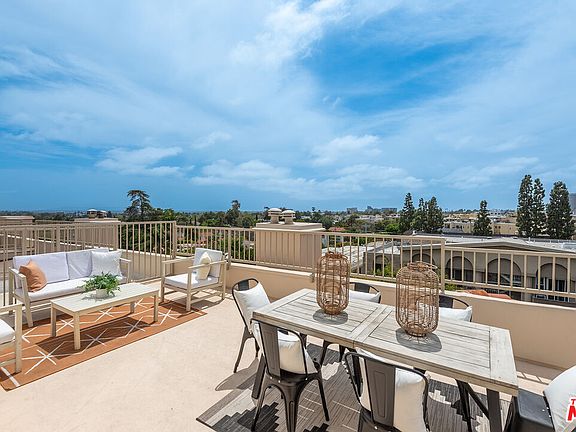 Experience penthouse living at its finest in this rare, front-facing northwest corner residence that seamlessly blends elegant interiors with exceptional outdoor living. Bathed in natural light and perched above a beautiful tree-lined street, this stunning single-level home features four separate outdoor spaces, including an expansive private rooftop deck of approximately 300 square feet perfect for entertaining, unwinding, and soaking in breathtaking city and treetop views with spectacular sunsets as your daily backdrop. The open-concept living and dining area is designed for both comfort and entertaining, featuring rich crown moldings, a cozy fireplace, and two front-facing balconies that invite the outdoors in. The chef's kitchen is a culinary dream, outfitted with stainless steel appliances, double ovens, and expansive counter space including a casual dining bar. The generously sized primary suite is a true retreat, complete with its own fireplace, private balcony, large walk-in closet, and a luxurious, spa-inspired bathroom featuring stone floors, dual sinks, a soaking tub, and a separate glass-enclosed shower. Two additional spacious bedrooms offer ample closet space, each thoughtfully outfitted for optimal storage. A stylish guest bathroom and an in-unit laundry area complete this refined, thoughtfully designed home. Located in a desirable, newer courtyard-style building a gated parking garage with guest parking, and the peace of mind that comes with secure, boutique living. Positioned in an unbeatable location just moments from UCLA, Westwood Village, Century City, and Beverly Hills, and within the sought-after Westwood Charter School district. This a turnkey opportunity to enjoy luxury penthouse living in the heart of the Westside.