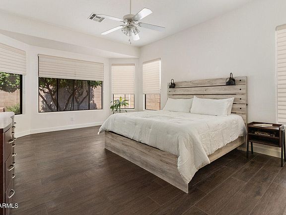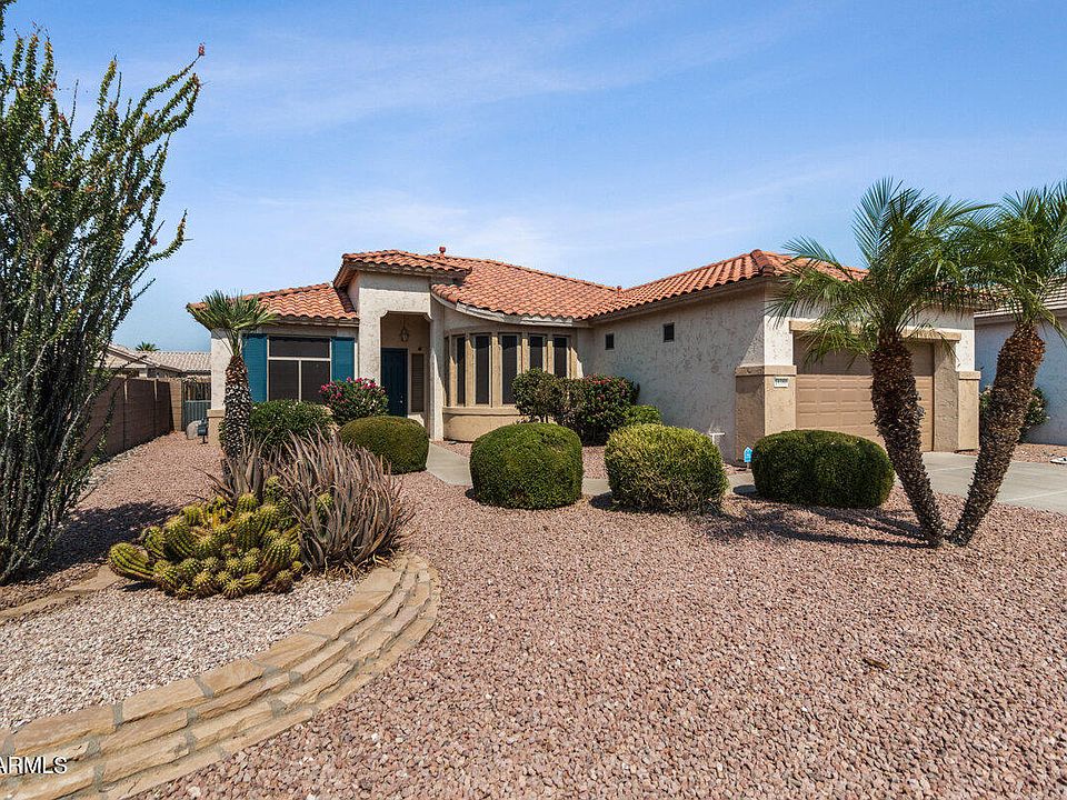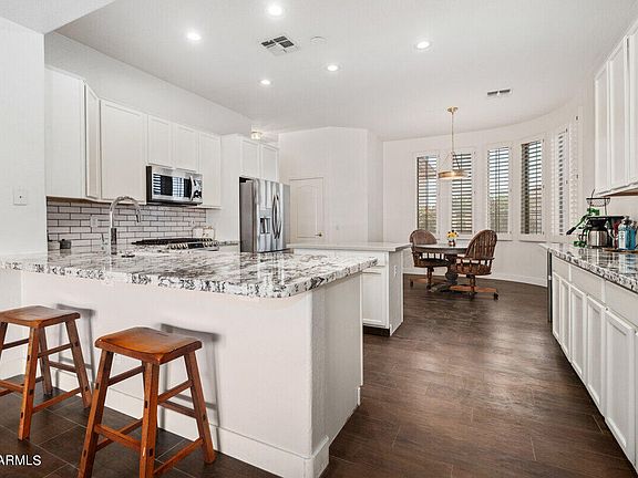 * GORGEOUS! Presenting a highly desired & updated 1964sf Tapatio in 55+ guard-gated Arizona Traditions resort with an open great rm flrplan & front facing kitchen! This home offers all tile wood look floors thruout most w/wood look laminate in guest bedrm. The updated kitchen has painted white cabs & the tall breakfast bar lowered to create a more open kitchen. Incredibly beautiful white granite counters w/unique black grain was added with quartz on island for baking! Breakfast room has bay w/tall windows & plantation shutters! The spacious main bedrm features lg bay windows, bath w/upgraded vanity, dual sinks, dual mirrors w/storage & beautiful mosaic tile floor! Den & Guest bedrm are split offering privacy for both. Lg laundry room w/deep sink & cabs! Plus Low Cost Leased Solar Saves $$$!