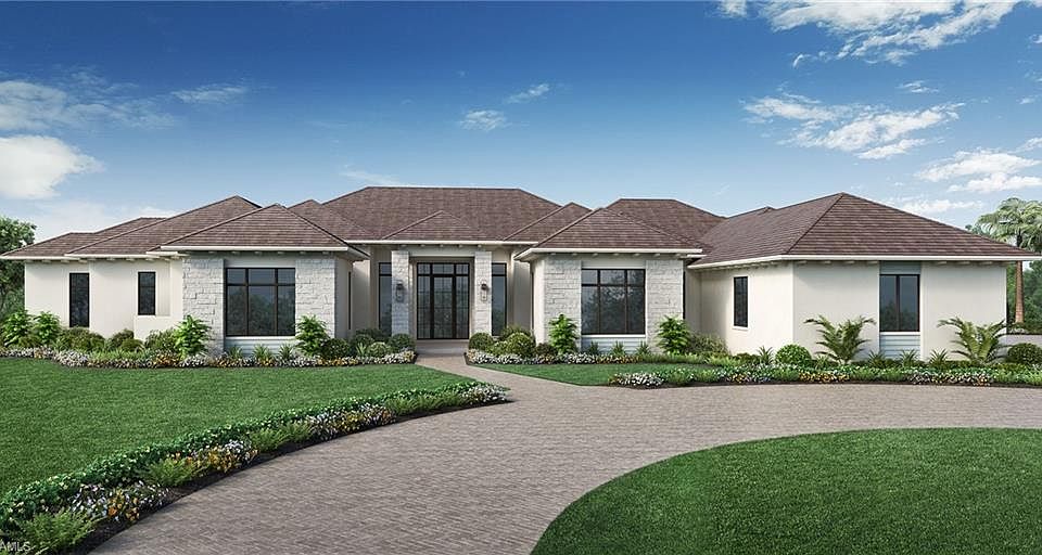 A one of a kind home nearing completion in Wildblue situated on one of the largest waterfront lots, 18384 Blue Eye Loop does more than just impress featuring Stock Custom Home “Calista” model, this estate lot offers a coastal lake-house style residence mixed with luxury and sophistication, an unparalleled living experience offered FURNISHED, designed by Soco Interiors. Fabulous open style living at it’s finest with 5,486 SF of under air living, 4 Bedrooms, 4 full bathrooms, 3 half bathrooms, 4 -car epoxy floored garage with circular driveway & 2 covered terraces. Textured organic materials and warm woods are featured throughout also including shiplap walls, cypress ceilings, wide plank wood flooring, custom built-ins, impact rated doors & windows, spray foam insulation, 2 tankless hot water heaters, solid core doors, home automation tray ceilings, climate controlled wine room & so much more! Every detail of this residence is meticulously crafted with the utmost high-end finishes to create a genuine coastal look. The spacious open chef’s kitchen includes natural gas stove, large seating Quartz island, Quartz countertops & full height backsplash, Sub-Zero & Wolf appliances. The adjacent dining and living areas offer stunning views of the waterfront, creating a serene and inviting atmosphere. Private Library or office space includes resin beams in tray ceiling, custom built-ins & wide plank tongue & groove feature wall. The master suite offers a relaxing retreat, with high vaulted coffered ceilings, custom walk-in master closets. Inviting master bath features a free-standing tub, custom walk-in shower, dual sinks & separate water closets. Paradise found right in your own backyard! The panoramic screened lanai spans the entire width of the house featuring a heated saltwater pool & spa, sun shelf & fire/water bowls. Warm up around the square stone fire-pit for those cooler Florida nights. Resin beams & tongue and groove at outdoor ceiling. The outdoor kitchen and tile-clad fireplace area are perfect for hosting gatherings & creating unforgettable memories with family and friends. Subzero under counter refrigerator & ice maker also featured. Residents of Wildblue enjoy a wealth of resort style amenities featuring over 800 acres of freshwater lake, 8 pickleball courts, exercise room, lap pool, spa, clubhouse, tennis, spa, nail salon, kayak & boat launch, walking trails, outdoor grille, bar & much more! With no expense being spared, this exquisite residence represents a rare opportunity to experience the best that Southwest Florida has to offer. This ultimate NW facing waterfront estate lot offers stunning fresh water lake views and a tranquil setting, making this residence a true oasis. Experience the ultimate in luxury living where every detail is designed to provide an unparalleled lifestyle of elegance and comfort.