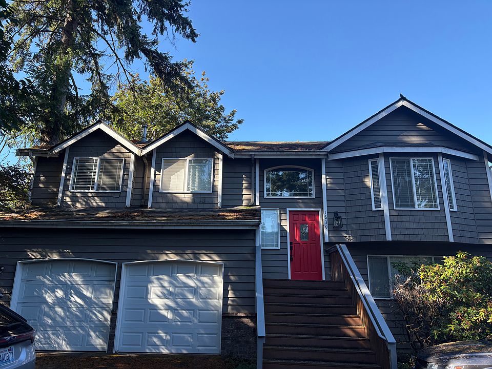 Split level home converted into two units . The upper floor is the available unit . Lower unit is occupied by owner. This property features an open layout with vaulted ceilings in living area. Comes with one spot in 2 car garage . Located off Main Street on long dead end driveway . Easy access to I-5 and public transportation.