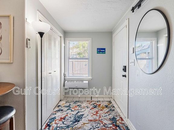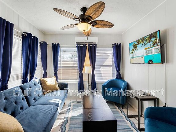 Annual furnished rental presenting a charming and well-appointed half-duplex featuring two bedrooms and one bathroom, thoughtfully designed for both style and practicality. Step into a bright living area furnished with a plush blue velvet futon, matching side chairs, and a multifunctional coffee table that doubles as a workstation. A mounted streaming TV and room-darkening shades create the perfect environment for movie nights or cozy evenings at home. The primary bedroom, tucked at the back of the home, offers a peaceful retreat with a queen-sized bed, hotel-quality linens, a bedside table, lamp, and blackout curtains for restful sleep. The fully equipped kitchen provides all the essentials for easy meal preparation, including cookware, dishes, and modern appliances. A versatile sunroom, once a screened-in carport, has been transformed into a bright and insulated year-round living space. Outfitted with vinyl windows, a portable air conditioner, and blackout curtains, this room features a pull-out sofa with a new memory foam mattress, additional seating, and another streaming TV, making it ideal as a guest space or quiet hideaway. The home's bathroom has been stylishly updated with a new vanity, cabinetry, walk-in shower, and designer fixtures. Situated on a peaceful cul-de-sac, the property offers a fully fenced yard and welcomes a small dog. Its prime location places you minutes from downtown Sarasota, SRQ Airport, shopping, dining, and a quick drive to world-famous Siesta Key Beach. Trader Joe's and local restaurants are just a short stroll away, blending convenience with a tranquil setting. Water and lawn care are included in the rental rate, plus resident benefits package added for $35.00 per month.