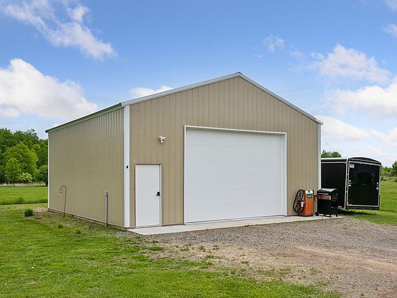 Welcome to your dream retreat! This stunning rambler built in 2021 offers the perfect blend of modern convenience and serene country living. Nestled on an expansive 5.83 acre lot, this property is a true gem for those seeking space, comfort and privacy. All living facilities are located on the main level including a private owner's suite with private bath. This open and airy layout is sure to delight. For those with a passion for hobbies and storage needs, the detached pole building is a standout feature. Measuring 30’ wide by 32’ deep with 13’ sidewalls, it includes a custom 16 x 11 overhead door, perfect for accommodating a camper or RV. The building is equipped with a concrete floor, a 100 amp electric panel, a service door, and two Thermo Tech windows, making it a versatile space for any project or storage requirement.