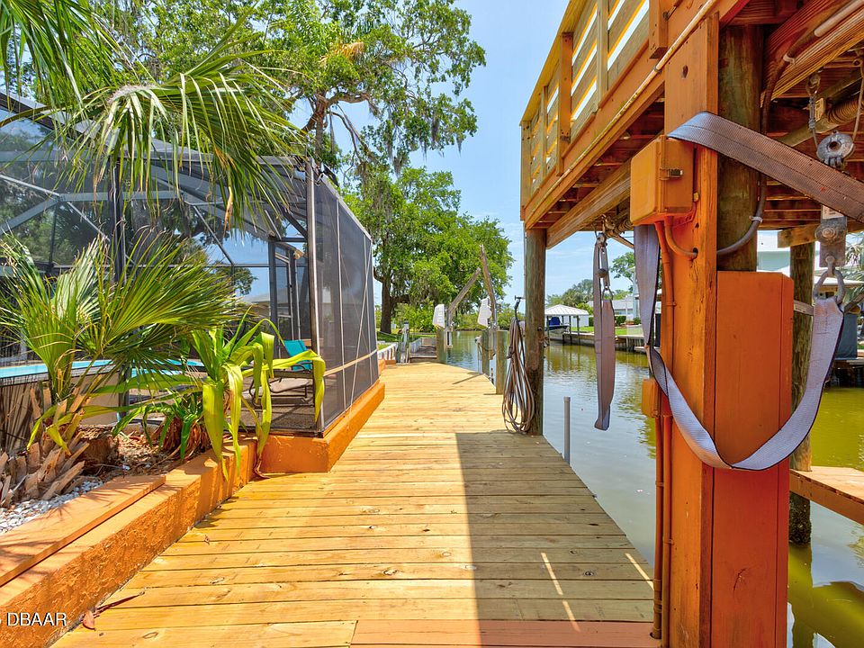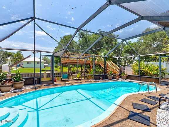Your Waterfront Retreat Awaits at 184 Azalea Rd. Tucked just three homes in from the open river in the sought-after Waterway Park community, this vibrant 4-bedroom, 2-bath waterfront pool home delivers an immersive Florida lifestyle experience—indoors and out. Step inside to find expansive living areas with panoramic views of the sparkling screened-in pool and the lush canopy over and beyond the canal, evoking the feel of a peaceful Amazonian retreat. The downstairs layout includes three bedrooms, a large full bath, and an oversized laundry room with built-in shelving and space for a second fridge—perfect as a service pantry or prep zone. Upstairs, a private and expansive primary suite spans the entire level, featuring enough room for a king-size bed and additional seating or workspace. French doors open to a private balcony offering glimpses of the river, and tree-draped skies ideal for birdwatching, stargazing, or morning coffee. Outside, the screened pool offers year-round enjoyment, while the expansive dockfully serviced and well-maintainedincludes davit boat lift, two PWC davits, and an upper observation deck for catching river breezes night launches or watching meteor showers dance across the night sky. For Hurricane peace of mind~ No History of the river ever entering this home:) Additional perks include ample driveway parking, no HOA, and a quiet, paved street just minutes from shopping. Whether you're looking for a weekend getaway or a full-time waterfront home, this property checks all the boxes for serenity, space, and saltwater boating and jet ski access.