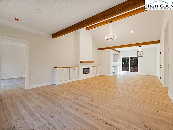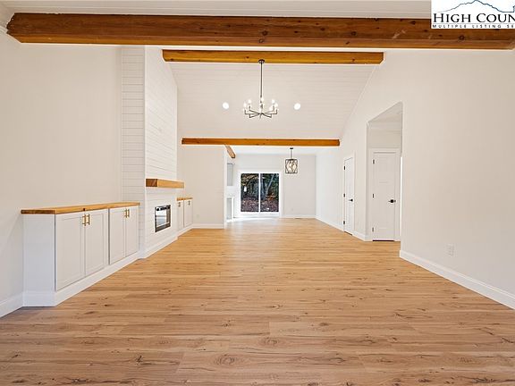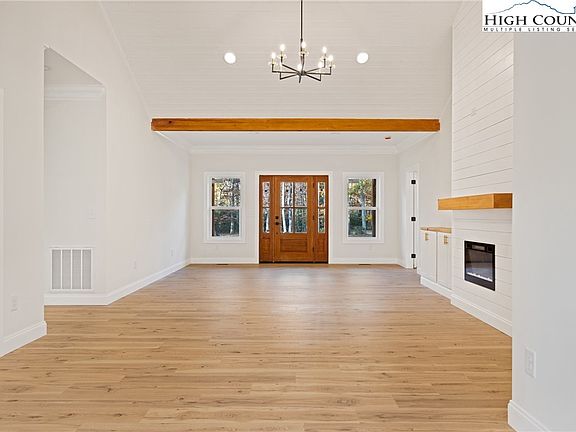 Discover this brand-new custom home, perfectly situated in a beautiful setting, with easy access to both Boone and West Jefferson. Nestled on a large, open one-acre lot, the property features a peaceful mix of open space with trees along the front and a natural buffer of trees along the side and back, offering both beauty and privacy. Inside, the home showcases a spacious open-concept floor plan that seamlessly connects the living, kitchen, and dining areas. The great room features a vaulted shiplap ceiling, wooden beams, and a fireplace with custom built-ins on each side, creating a warm and inviting focal point. The kitchen is a showstopper with quartz countertops, soft-close cabinetry, a farmhouse sink, pot filler, pantry, and stainless steel appliances. A mudroom is conveniently located off the kitchen and includes a built-in storage bench and ample storage space with a separate entrance. Throughout the home, you will find high-end light oak LVP flooring, complemented by custom tile in the bathrooms. The private master wing features a spacious bedroom with crown molding, a walk-in closet, and a luxurious bath, with a granite double vanity and large tiled shower. Two additional bedrooms on the opposite side of the home offer the same quality finishes, along