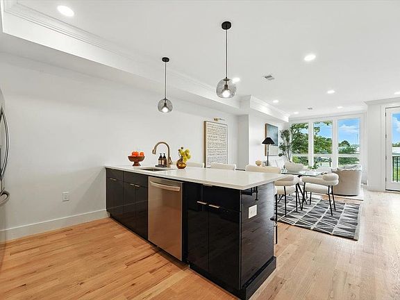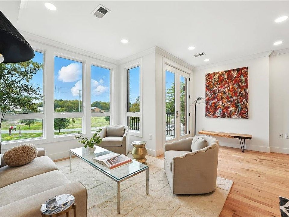 Light floods in through the floor-to-ceiling windows and double glass doors welcoming the Western facing sunsets and highlighting the light oak hardwood floors. The kitchen is sharp and thoughtfully composed with deep navy lower cabinets, white uppers, clean quartz counters, herringbone tile, and stainless appliances. The eat-in peninsula opens easily to dining and living, with access to a private balcony that sits just above the treetops.