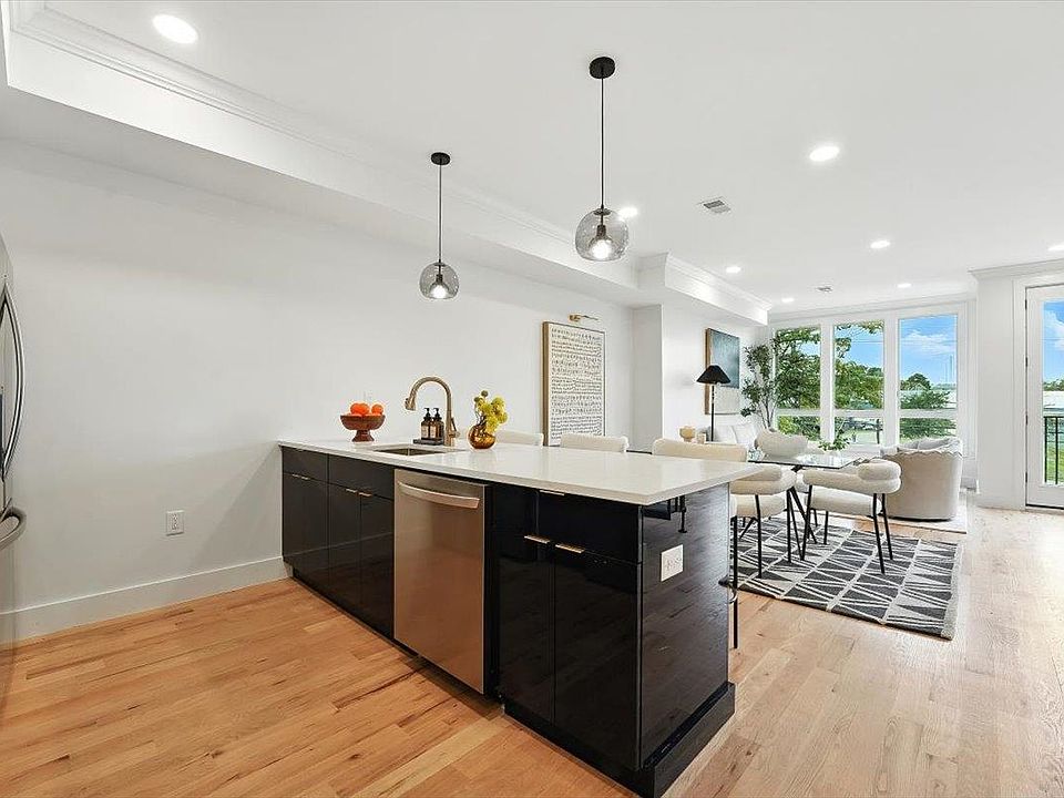 Light floods in through the floor-to-ceiling windows and double glass doors welcoming the Western facing sunsets and highlighting the light oak hardwood floors. The kitchen is sharp and thoughtfully composed with deep blue lower cabinets, white uppers, clean quartz counters, herringbone tile, and stainless appliances. The eat-in peninsula opens easily to dining and living, with access to a private balcony that sits just above the treetops.