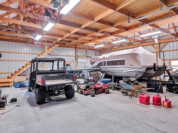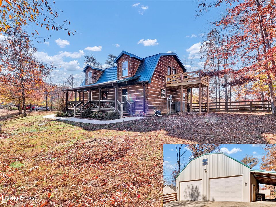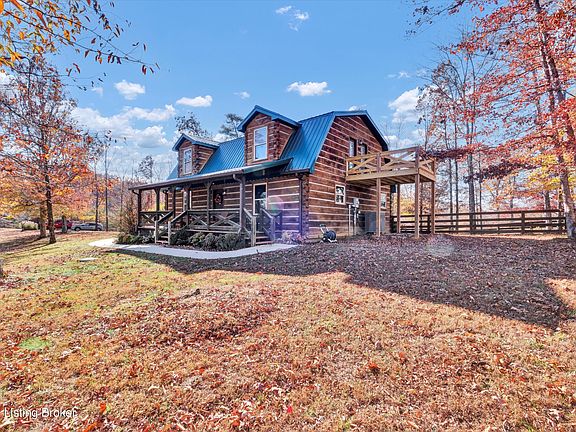 Welcome to 184 Furnace Branch Road-your serene retreat in a gated Nolin Lake community! Designed for low-maintenance living, this concrete log-sided home offers multiple outdoor spaces where you can unwind & enjoy Mother Nature's magic. Choose from the inviting covered front porch, side deck, rear covered deck, second-floor deck accessible from two bedrooms, or gather around the fire pit for evenings under the stars. Step inside to an open floor plan highlighted by a spacious kitchen, adjoining two-story dining area, & a great room featuring a real wood-burning fireplace—perfect for cozy lake nights. The main-level primary suite offers comfort and privacy with its own full bath. A conveniently located half bath near the back entry and a nearby laundry room add to the home's practicality. Upstairs, you'll find two additional bedrooms and a full bathideal for family and guests. Everyone knows that when you have a lake house, you have toys! This property includes a 36' x 40' outbuilding with oversized overhead doors to accommodate boats, ATVs, lake gear, or serve as an incredible man cave or entertainment space. A floored-off loft provides even more storage. Part of the lot is fenced for added utility and peace of mind. Most furnishings can remain for a move-in-ready experience. No rentals are permitted in this development, protecting the peaceful environment and your investment. A private docktransferrable with Corp of Engineers approvalcomes with the property, and a blacktop path offers direct, easy access. Qualifying owners may also obtain a permit to use a motorized vehicle all the way to the dock. Whether you're seeking full-time living or a weekend family retreat, this Nolin Lake getaway is ready for you. Start making memories today!