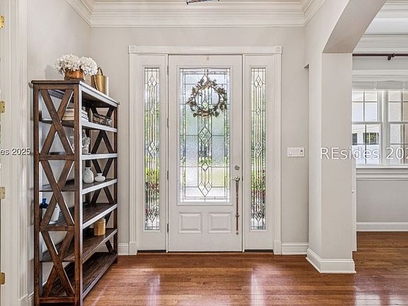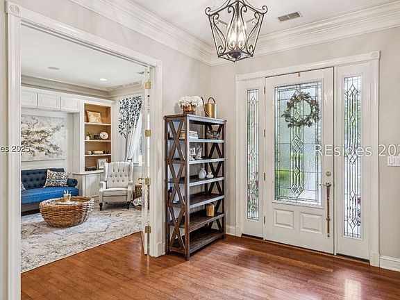 **Limited Time Buyer Bonus -$28K required 2025 Hampton Hall Social Membership Paid by Seller** Live Luxuriously in -Literally- the former model home, where timeless elegance meets effortless Lowcountry living. Perfectly situated on a quiet cul-de-sac in prestigious Hampton Hall, this 3-bedroom, 2.5-bath single-story residence offers refined craftsmanship and thoughtful design - plus an office/den, screened lanai, and oversized 2-car garage. From the moment you step inside, you'll be greeted by soaring 10-foot ceilings, 8-foot doors, rich crown molding, and gleaming hardwood floors that flow throughout the living areas. The expansive great room is anchored by a cozy fireplace and built-in cabinetry ideal for relaxing or entertaining. A light-filled formal dining room and den/home office with built-ins add style and flexibility. The gourmet kitchen is a chef's dream, featuring a large center island, bright breakfast nook, stainless steel appliances, and plentiful cabinetry -perfect for hosting or enjoying quiet mornings. Retreat to the oversized primary suite with spa-like ensuite bath, and a generous walk-in closet. Two well-appointed guest bedrooms include special touches like a charming custom window seat. Step out to the screened lanai and take in tranquil peekaboo views of the 1st tee, complemented by a low-maintenance yard- peaceful retreat after a round of golf or a day enjoying resort-style community amenities. This meticulously maintained home boasts a 2024 roof, 2017 HVAC system, newer water heater, and updated appliances offering modern comfort and peace of mind. Just a short stroll to Hampton Hall's world-class amenities including indoor and outdoor pools, tennis and pickleball courts, a Pete Dye golf course, fitness center, clubhouse dining, and miles of scenic walking trails. Don't miss this rare opportunity to own a move-in ready, high-end model home in one of Bluffton's most desirable communities-