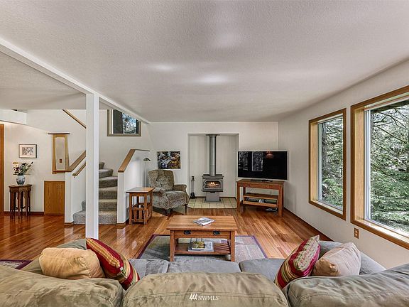 Escape to your very own slice of picture-perfect paradise w/ this Sudden Valley beauty! Live in a setting enveloped by green space near a tranquil creek & only moments from trails, Lake Whatcom & a plethora of must-have amenities. Soft natural light floods in through the walls of windows & skylights creating a space to rest & recharge at the end of the day. The living space is open & comfortable w/ gorgeous hardwood floors, a cozy wood fireplace & a free-flowing design. Bask in the dappled sunshine that filters down through the mature trees from the decks. PLUS theres a studio apartment below! This bonus living area has a full kitchen & a 3/4-bath. Work from home or accommodate guests who come to visit & share in this delightful abode.