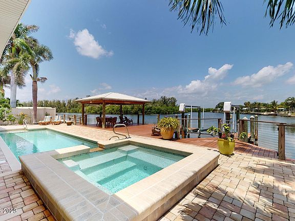 Pool Home on Banana River! Completely updated! Gorgeous pool with large spa leads out to covered dock/entertaining area with amazing views! Dock w/lift and canoe/kayak entry dock! Paver pool area! Home has open floorplan with travertine marble floors, crown molding & high ceilings w/wall of slider for superior view of water! Island kitchen has granite counters, rich cabinets & SS appliances. 3 bdrms plus large office w/built in cabinets/desk! Owners suite w/wood flooring & spa retreat bath w/double sinks, walk in shower, jetted garden tub & huge walk in dressing room w/organizers. Split plan! Bedrooms 2 & 3 both have wood flooring and large closets. Guest bath with large shower. Plenty of closets! Inside expansive laundry room w/sink and cabinets! Landscaped Yard! Metal roof from 2015!