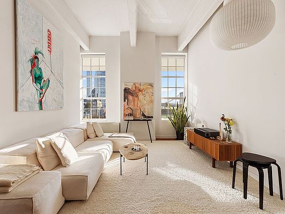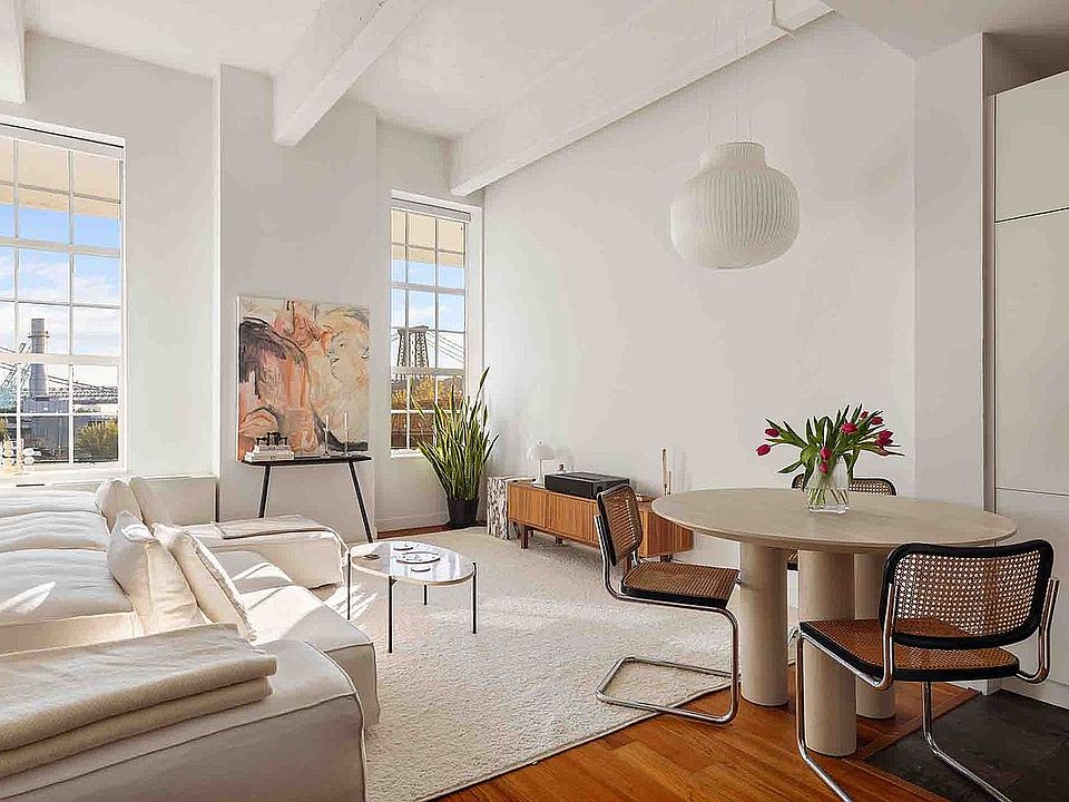 Soaring 11-foot ceilings and oversized casement windows in both the living room and bedroom flood the home with coveted south-facing light throughout the day, framing views of the city and Williamsburg Bridge.