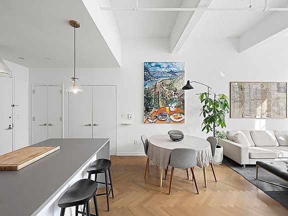The kitchen seamlessly connects to the sprawling living area featuring soaring beamed ceilings atop Herringbone tobacco smoked oak wood flooring, exuding the historic charm of loft living. Large windows grace the living space, bathing it in natural light.