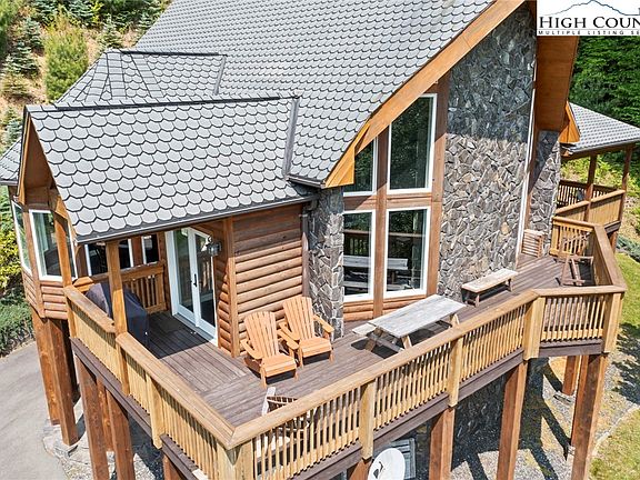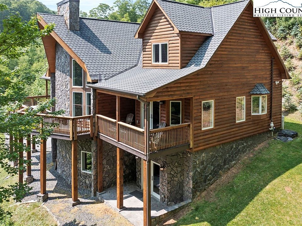 Introducing a captivating Mountain retreat! This upscale Mtn home nestled on a serene 27.97 acres offers a picturesque setting w/ breathtaking Mtn views & a rushing creek. With 4 BR, including an extra living area/game room, & 3.5 BA, there is abundant space for relaxation & entertainment. Step inside to discover the impressive interior featuring granite counters, complemented by exposed beams & a vaulted ceiling, creating an inviting & warm atmosphere. Warm up beside the floor to ceiling gas stone fireplace in the winter. An indulgent hot tub awaits outside, providing the perfect spot to unwind & take in the natural surroundings. Natural light floods the home, accentuating the freshly painted interior, which exudes a clean & modern aesthetic. Additional amenities include a single car garage, ample parking space, firepit, luxurious steam shower, & a large walk-in closet in the master suite. For book lovers, a charming library loft offers a peaceful refuge. With its impeccable landscaping & Mtn charm, this home is an idyllic Mtn retreat. Experience the tranquility & sophistication of this extraordinary property. Only 15 minutes to Boone! The Mountains Are Calling…Are You Listening?