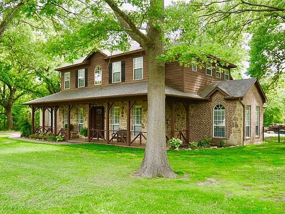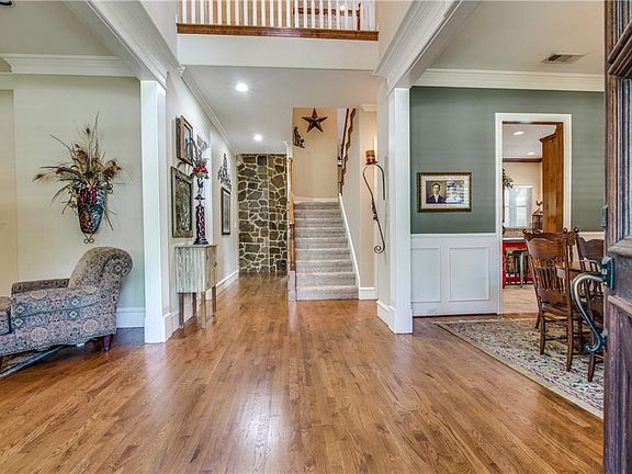 Beautiful Custom Home (approx 3832sf per tax) nestled on 1+ acres w 3car garage, swimming pool & waterfall. Home features hardwoods, 8ft solid core doors, extensive custom trim & millwork, 20+ ft ceilings, exposed wood beams, granite counters, stainless appliances, & floor to ceiling Oklahoma Flag Fireplace. Over sized rooms & closets w tons of storage. Master suite shows off its style w fireplace, walk in shower, garden tub, custom closet & dual vanities. Beautiful views w dual wrap around porches, mature trees, winding creeks & landscaping. Owner to give $2000 allowance w acceptable offer. Ask about extra possible office for purchase on 1 acre!