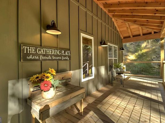 Escape to 184 Rockhouse-a one-of-a-kind luxury treehouse retreat gracefully suspended in the breathtaking treetops of Cashes Valley. Completed in 2022, this turn-key, 3-bedroom, 3-bath cabin blends refined comfort with rustic elegance across its 2,240 sq ft. Experience elevated mountain living with soaring vaulted ceilings, expansive wall-to-wall windows, and panoramic views that create a peaceful sense of floating in nature. The home sleeps up to 10 guests with a secondary living space, game room, and custom bunk area, making it ideal for groups. Perfectly positioned between Ellijay and Blue Ridge, the location offers unmatched access to the best dining, shopping, and outdoor adventure. Nestled on a private 1.48-acre lot, you get deeded access to a community pond and the iconic Fightingtown Creek for fishing and kayaking. Outdoor enthusiasts are close to the Benton MacKaye Trail and USFS land. Inside, enjoy high-end finishes like leathered granite countertops, stainless steel appliances, durable LVP flooring, and a thermostatic wood-burning stove. The true luxury treehouse experience is completed by spa-style bedroom suites, a wraparound porch, a firepit, and a hot tub for star-lit evenings. As an investment, this property has been exceptional, generating six-figure rental income since mid-2023 with over 73 five-star guest reviews. Features like a metal roof, Hardie siding, low taxes, and no HOA add to its reliability. 184 Rockhouse invites you to live among the treetops, relax above the world, and experience the magic of Cashes Valley.