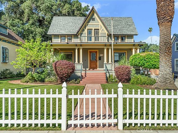 Quintessential Redlands Victorian Home. Step into the timeless charm of this beautiful Victorian built in 1887 and ideally located in the heart of Redlands. This spacious 1,811 sq ft home offers a perfect blend of historic character and thoughtful updates, all set on a generous 9,075 sq ft lot. From the classic front porch with a porch swing to the warm wood floors and abundant natural light, this home welcomes you in. The living and dining areas flow seamlessly, with the dining room featuring a custom-built-in library wall that adds both charm and function. The open kitchen has been updated with newer countertops, a designer tile backsplash, stainless steel appliances, and a butcher block island—perfect for everyday living or entertaining guests. On the main level, you'll find a flexible bonus room that can serve as the 4th bedroom, home office, or cozy den (note: no closet), along with a nearby ¾ bathroom. Upstairs, the home offers two secondary bedrooms plus a spacious primary suite featuring a walk-through dressing area, ensuite bathroom, and private upper-level deck with sweeping views of the Redlands Bowl and neighborhood—an ideal space to relax and unwind. Outdoor living shines here with a second covered porch at the back of the home, a large grassy flat yard perfect for gardening or gatherings, and a storage shed for tools and extras. Home also offers a 500+ bottle wine cellar!