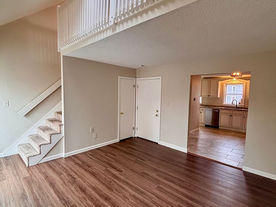 The large living room has plenty of natural light thanks to a sliding glass door opening into a shared back deck. Interior stairs lead up to the gut-renovated bathroom and bedroom that overlooks the living room area. The bedroom also has a generously-sized walk-in closet.