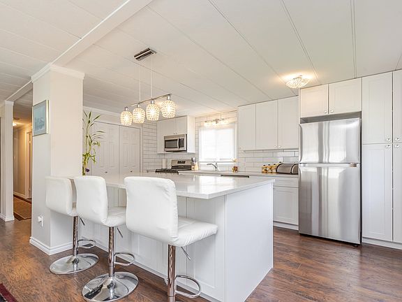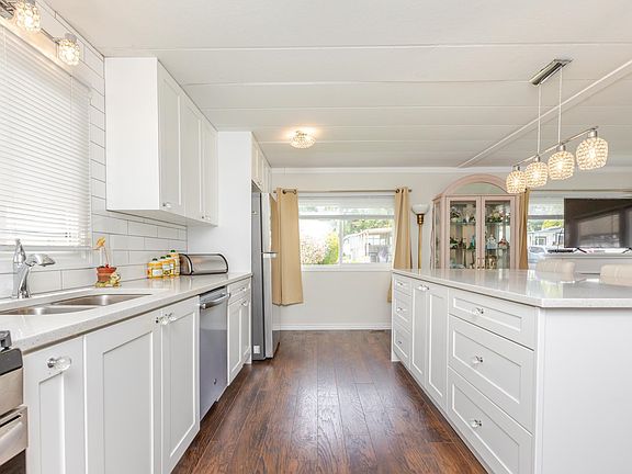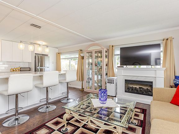 Welcome to Breakaway Bays, a wonderful community for retirees and families. Bright & spacious completely renovated 2 bed, 2 bath double-wide , Open concept living. Features include a designer kitchen with island & "NEW" Appliance incl Gas stove!, vinyl windows, 4 yr old roof, NEW hot water on demand, NEW heat pump (Air Conditioning), large laundry room with extra storage, and attached 10' X 10' powered workshop and so much more! Enjoy a private large backyard, garden beds, covered carport, and resort-style amenities including a pool and rec center. No age restrictions, Pets allowed with restrictions, Minutes to White Rock Beach, US Border, shopping & more! 6 MONTHS FREE PAD RENTAL ON CLOSING