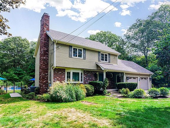 Spectacular and private! Look no further than this one-owner, impeccably maintained colonial set on a sprawling 2-acre lot. This beautiful home features a classic brick front with clapboard and wood shingle exterior. The curb appeal is enhanced by well-manicured landscaping and updated windows. The main level boasts a full open floor plan, perfect for modern living and entertaining. The impeccably updated eat-in kitchen shines with quartz counters, a dining area, and is filled with natural light from abundant windows and recessed lighting. Relax in the cozy family room by the gas-fired fireplace. A convenient half-bath completes the first floor. A full hardwood staircase leads to the upper level, featuring hardwood floors throughout. Here you will find 3 large bedrooms with vaulted ceilings and a main bathroom with a double sink vanity, tub, and shower. The primary bedroom is a true retreat, offering a large walk-in closet and a private full bath with a custom tile shower and granite countertop vanity. The partially finished basement provides a great TV room or flex space with a full walkout via a bulkhead. Additional features include central air conditioning and an updated roof. Your private backyard resort awaits with a heated in-ground pool. Complete with a two-car garage, this home is the definition of move-in ready.