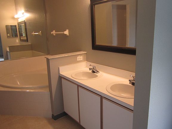 Master bedroom has a connected bath with a Garden Tub and a separate Shower. Features dual sinks and an expansive mirror.