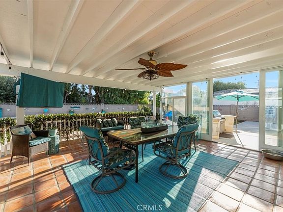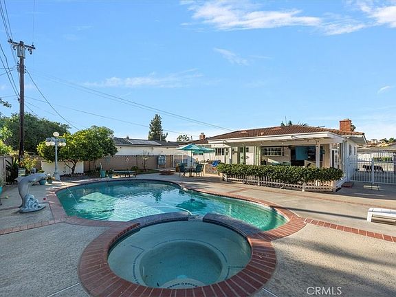 A backyard entertainers' dream, this La Habra pool home is ready and awaiting gatherings of friends and family! A classic 1950's traditional ranch, with updates throughout, a thoughtful and open floorplan, and close to excellent schools including El Portal Elementary (rated 9/10 by GreatSchools) make this home a rare find. Enter into the expansive living room, which flows past the fireplace into the dining area and kitchen with a massive island and plenty of cabinet space. From the dining area, step outside and you are transported to a tropical oasis in The OC. A 500+ square foot semi-enclosed patio with saltillo tile flooring makes outdoor dining by the pool a year-round treat. The gorgeous pool has an integrated spa with waterfall, and the most adorable, fun dolphin fountain you've ever seen! Fruit trees provide fresh mangoes and limes. Inside, you'll find the primary bedroom suite with remodeled 3/4 bath. Three additional bedrooms and a remodeled full bathroom offer plenty of sleeping and working spaces. A bonus room has been carved out partially from the 2 car garage, providing additional space, which could easily be converted back if the new owner prefers to park two cars indoors, in addition to the ample parking space in the driveway and room for additional vehicles or even a truck or rv behind the custom galvanized iron gates on the west side of the house. The roof is maintenance and worry-free bonded aluminum, with a classic Spanish tile look. Double-paned windows help keep the home cool and quiet. Palm trees round out the California look and feel. Make yourself at home in La Habra!