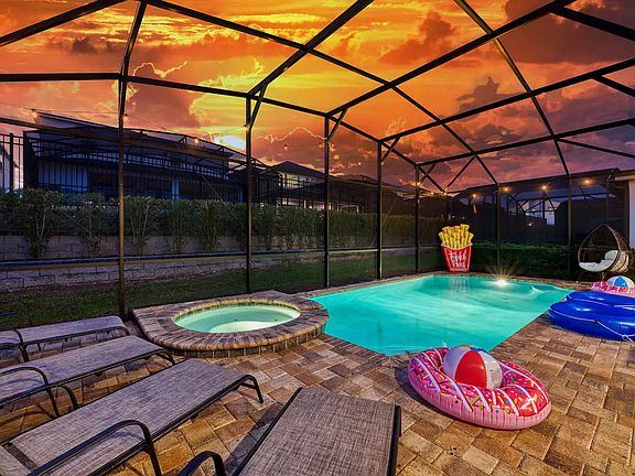 Step into a world of comfort and magic with this exquisitely designed villa, nestled in the heart of the sought-after Solara Resort, a gated paradise just moments away from Disney. This fully furnished home offers seven spacious bedrooms and 5.5 bathrooms, providing ample space for relaxation and enjoyment. With two living areas, a game room, and a movie theater room, there's plenty of room for entertainment. The villa also features a large kitchen with stainless steel appliances, two indoor dining areas, and an outdoor oasis complete with a private patio, pool, and hot tub.