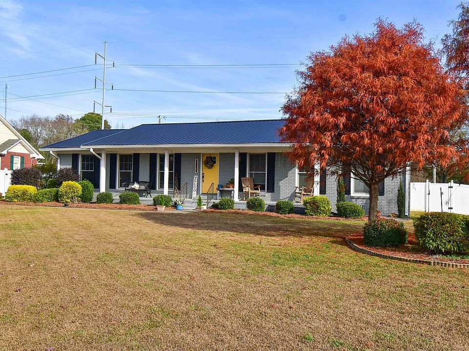 Outside features a rocking-chair front porch, covered back patio, and a large fenced backyard on a 1/2-acre lot with space for a fire pit. Irrigation system added to help maintain the lawn in summer.