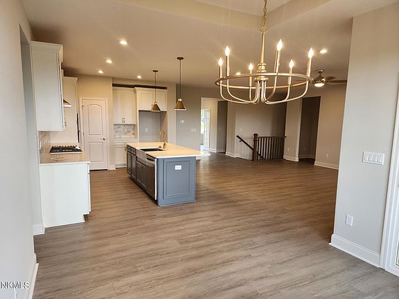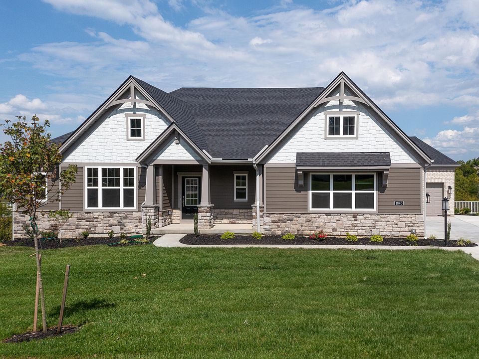 This completed Drees' Lyndhurst plan offers comfortable one-level living in a ranch plan nestled on a large lot. The open central living area includes a large family room with a bright and airy dining area nook and kitchen with oversized island and gourmet appliances. The covered porch off the dining area is a great space to relax or entertain all year round with a cozy fireplace.