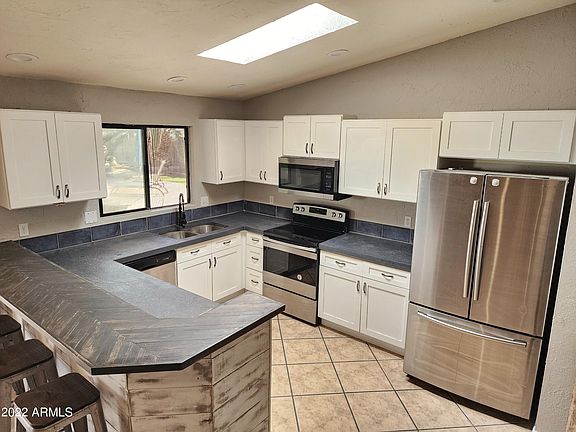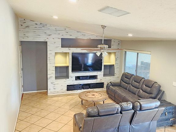 This home is a perfect 10! Backyard is HUGE with large grassy area & self-cleaning pebble-tec pool with a waterfall! Patio with mist system, grill, smoker, fridge, fan & speakers. Tiled floors throughout, custom entertainment center. Open kitchen with custom concrete countertops, skylight, breakfast bar! 12 ft RV gate, huge concrete pad and storage shed, oh did I mention the A/C in garage & cabinets?!!