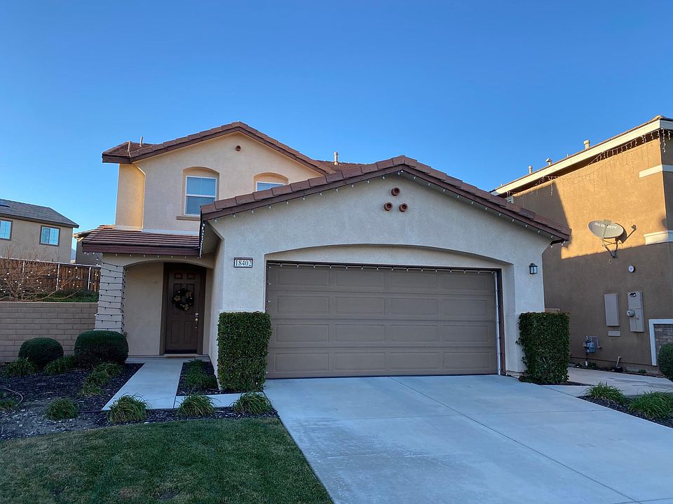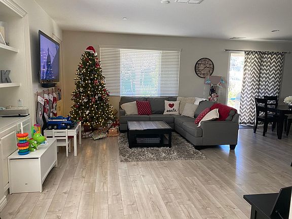This 3 bedroom, 2 bathroom, 2 car garage home in Rosena Ranch is a two-story home that shows like a model home. Short five minute walk to Paakuma' Park and School. Open concept floor plan with spacious kitchen, dining room and great room with fireplace. Tall/vaulted ceilings on first floor with laminate hardwood flooring and a guest bathroom with pedestal sink. Kitchen with granite counter tops, custom backsplash, cabinet knobs/handles with slow-close cabinets/drawers. Black stove, microwave and dishwasher. All three bedrooms are upstairs: master bedroom with two separate closets and bathroom with dual sinks and oversized shower. Two additional bedrooms and a second full bathroom upstairs with tub. Garage has two large SafeRacks overhead storage areas. One of the few oversized backyards in Rosena Ranch. Gated dog run and side shed available. Patio cover and gas valve for BBQ hookup. Large custom concrete side patio area with overhead lights. Backyard has a swivel TV mount setup ready if needed.