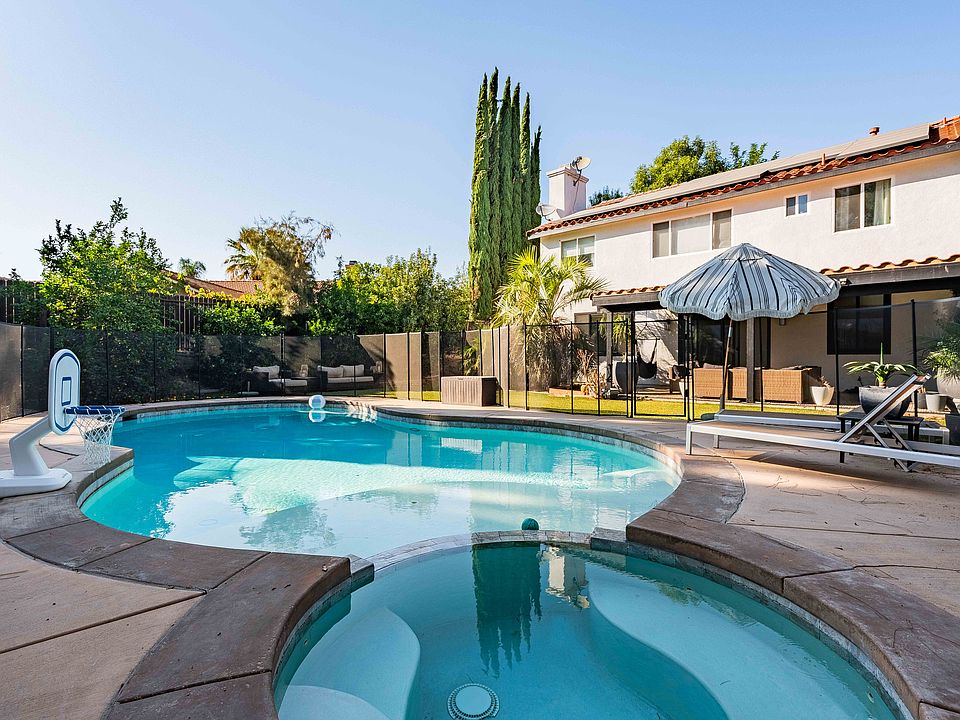 18404 Arminta Street is a beautifully updated home nestled on a private flag lot. As you enter, you're greeted by a spacious living room with soaring double-height ceilings and abundant natural light pouring through the windows. The thoughtfully renovated kitchen features stainless steel appliances, a center island, and elegant white cabinetry, seamlessly flowing into the dining room, which includes a fireplace and sliding glass doors that lead to the backyard. With four well-appointed bedrooms three on the second level and one conveniently on the first this home is prepared to cater to any lifestyle. The sprawling primary suite boasts a vaulted ceiling, electric blinds, a spa-like en suite bath, and a walk-in closet. Modern upgrades include renovated bathrooms, an ADT security system, Google Home integration, and an EV charger in the garage. Outside, the resort-style yard features a large pool, spa, turfed lawn, covered patio for al fresco dining, and a basketball court. Guest house has been leased separately. Small dog allowed with pet deposit. Tenant responsible for all utilities.