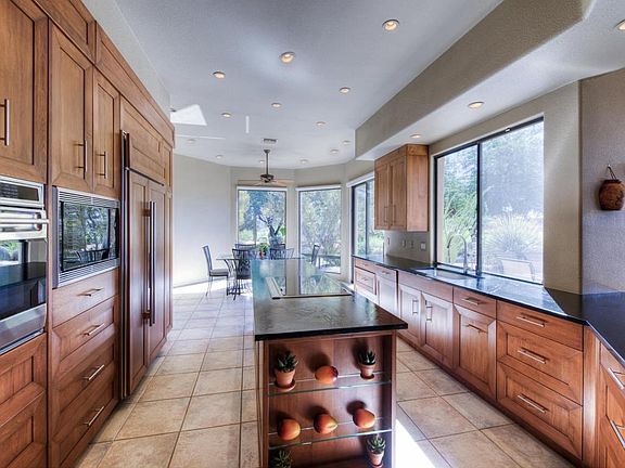 Santa Barbara contemporary home with many of the most wanted upgrades. Kitchen features soapstone counters, SS Wolf smooth cooktop, Subzero refrig w/wood front. Asko Dishwasher w/wood front, Neutral cabinets and wine cooler w/glass door. Walk in pantry. Breakfast room overlooks Golf course. Bowed window in formal dining room. Great room w/niche wall and fireplace opens to kitchen & dining with sliders to patio. 2 Bedrooms + a den & 3 baths. Master suite has double coffered ceiling transom windows, en suite bath has jetted tub and snail shower. Window treatments include plantation shutters and Silhouette shades. Wood floors in the Bedrooms & carpet in the den. Powder room also has corner shower. Built in Cabinets in garage. Solar hot water heater, 2 car + golf cart garage.