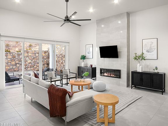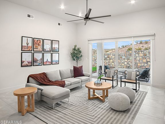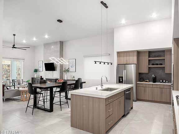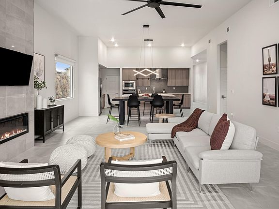 This stunning home includes a private-entry guest suite with its own kitchen (refrigerator, stove, oven, dishwasher, sink), stackable washer/dryer, and zoned HVAC—perfect for guests or multigenerational living. The main home offers a chef's kitchen with Maytag stainless steel appliances, walk-in pantry, refrigerator, 12-ft ceilings, and breathtaking views. A stylish powder bath adds charm when hosting. The tranquil primary suite, 8-ft doors, tile throughout, and curated designer finishes create a one-of-a-kind masterpiece. With window treatments, front and backyard landscaping, 2x6 exterior walls, OSB sheathing, spray foam insulation, and a post-tension foundation, this home blends beauty, function, and durability for generations to come.