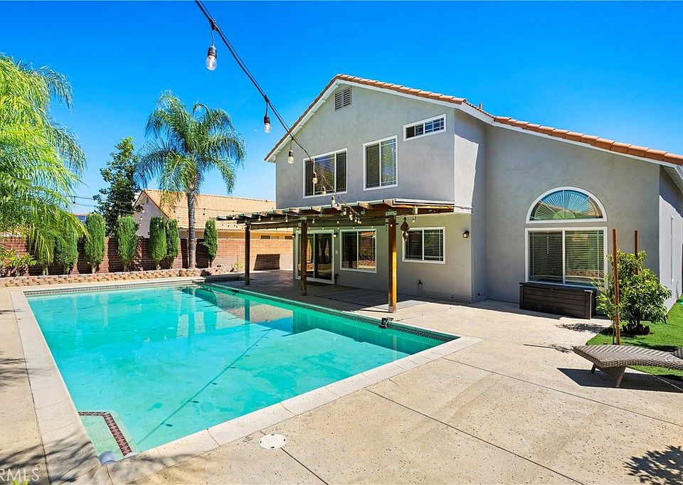 The backyard is an entertainer’s dream with resort-style in-ground pool and spa, spacious patio area, block wall fencing for privacy, and lush landscaping with fruit trees.
