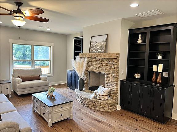 Take advantage of rates starting at 3.99%! Discover this beautifully crafted 4-bedroom, 3-bath craftsman-style ranch home offering rare single-level living with no HOA-all just minutes from I-20, shopping, and dining! Step inside through a charming glass front door and be welcomed by a warm, inviting open floor plan designed for both comfort and entertaining. The cozy family room features built-in bookcases, a stone fireplace, and a signature hearth, creating the perfect gathering space. The chef-inspired kitchen is a true showstopper, featuring ample soft-close cabinetry with upgraded hardware, a Ruvati workstation sink, gas cooktop, double oven, microwave, breakfast bar, and a spacious walk-in pantry. The adjacent open dining area ensures seamless hosting and family meals. Retreat to the spacious owner's suite with a spa-like en-suite, complete with his and hers vanities, a soaking tub, tile shower, and a large walk-in closet with direct access to the laundry room. You'll love the split bedroom plan offering generously sized secondary bedrooms with walk-in closets, offering ample space and storage. Enjoy outdoor living on the covered rear porch-perfect for grilling or relaxing dinners in any season. The oversized garage comes equipped with a garage door opener and remote, while the extra-wide driveway and sidewalk provide added convenience and curb appeal. The Smart Home offers the option to add additional devices providing convenience at your fingertips. This move-in ready home blends quality, functionality, and location. Don't let this one get away, schedule your showing and present your offer today! Some rooms virtually staged.