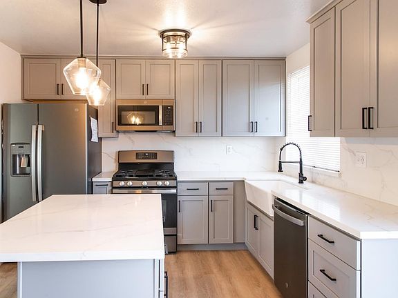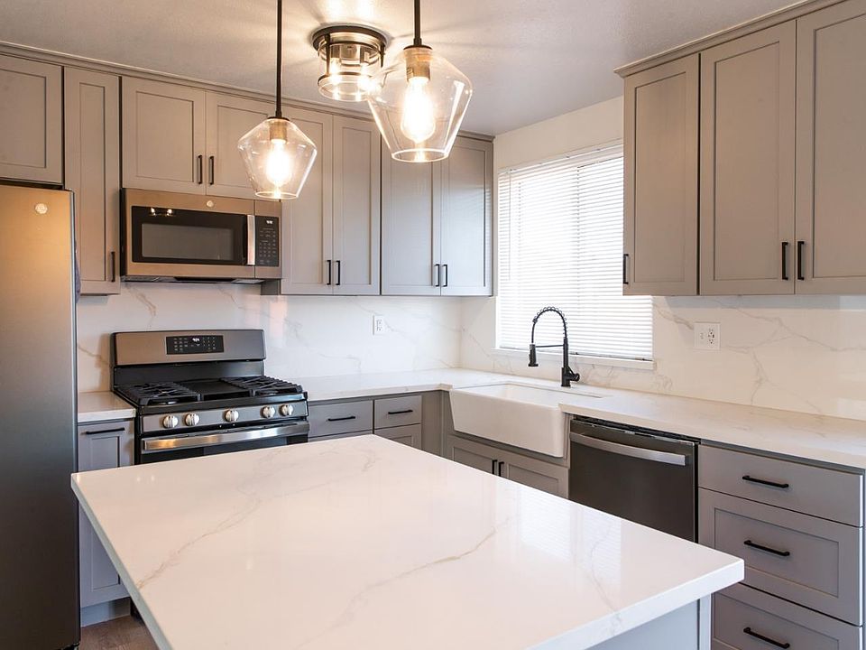 New interior doorsFully fenced spacious backyardStylish light fixturesSizeable centered islandFresh interior paintUpdated baseboardsCeramic farmhouse sink