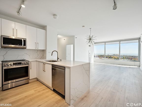 Newly renovated two bedroom + den with skyline and lake views! Open floor plan with new hardwood floors, floor-to-ceiling windows, and a balcony. The kitchen has brand-new appliances, counters, and cabinets. A spacious primary bedroom with an on-suite full bathroom. The den can easily convert into an office or dining area. In-unit washer and dryer. Reserved parking in the heated garage is $250/month. Building amenities include a 24hr door staff, fitness center, rooftop pool, party room w/kitchen, dog run, & on-site maintenance. Very pet-friendly building. Close to the lakefront, parks, shopping, & restaurants! Move-in ready!