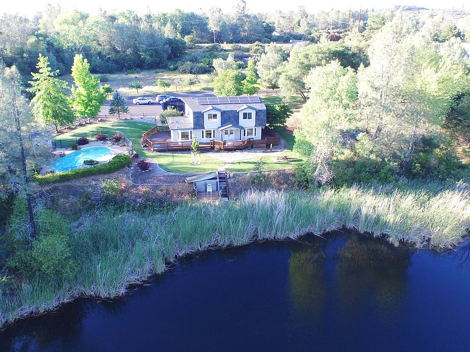 LAKE FRONT. Home nestled on all-usable 5 Acres with private lake. Built-in Pool. Solar home/solar heated pool. Private gate entry. 2007 Kitch remodel, silestone tops, stainless steel appliances, hickory cabinets. Master bath remodeled in 2015; guest bath remodeled in 2019. 4 Beds. 2.5 Baths. Parking galore! 3-Car Garage PLUS HUGE separate 1700 sq.ft. RV Garage & Shop with running water, toilet, separate meter with 220v. Spacious driveway - sport court action. Security system. Whole house fan. SEE VISUAL TOUR for AERIAL VIDEO shots at www.1841Starbuck.com