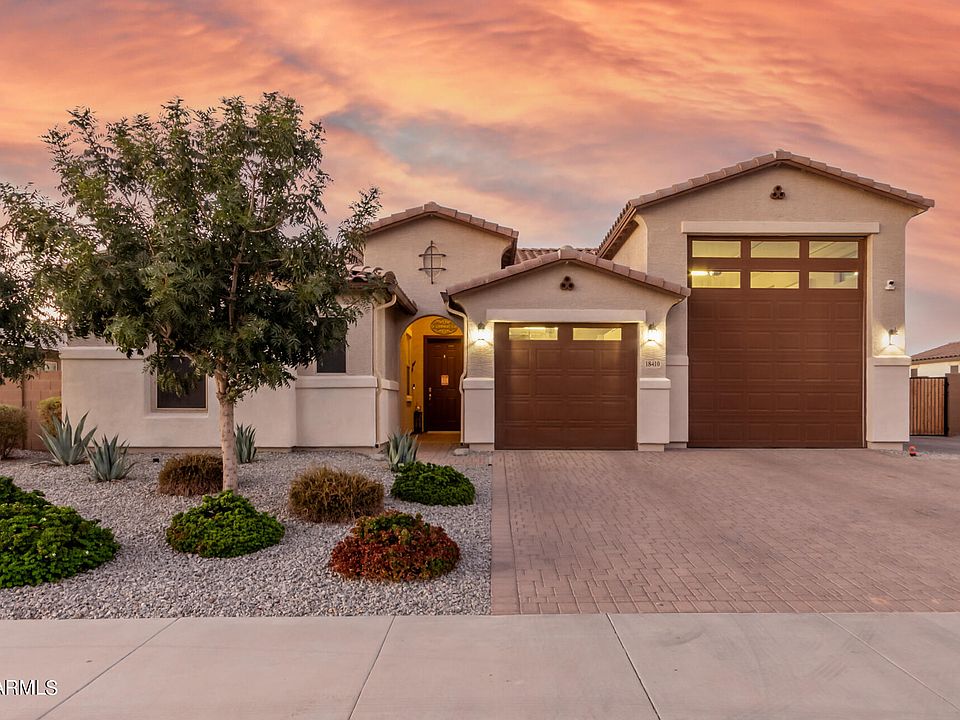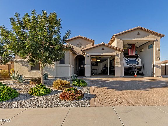 Come see this versatile property that offers an enclosed RV garage & a wonderful place to call home! In addition to 3 bedrooms, this great room floor plan also offers flex space that can be used as a game room, work out area or office. Enjoy spacious green parks, walking paths & a quiet neighborhood. This well-kept open floor plan is sure to please with it's upgraded kitchen featuring stylish cabinets, tiled backsplash, roomy kitchen island & Quartz countertops. The insulated garage is also enhanced w/ mini splits to cool your work space, has an overheight area, & an extended length for a variety of enclosed parking options as well as custom cabinets/storage rack. Other features include: extended paver driveway which leads to a concrete pad behind the utility gate, & back patio pavers! Bonus misc items: RV garage portion measurements are 40 ft in length and 14ft tall door with 16ft clear height, large walk-in tile shower in master, tiled 2nd bath shower, water softener, 2 year old water heater, whole house surge protector, wired fiber optics for improved efficiency and speed of telecommunications services/internet transmission, sun shades on sun bearing windows, custom tint on Arcadia doors and east facing windows.