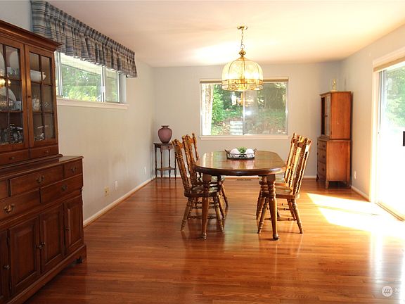 Relaxing private setting on quiet dead-end street. Unique floorplan that horseshoes spacious dining rm, kitchen, & Primary bedrm w/sliders to entertainment size deck overlooking patio & bkyd w/fire pit. X-large Primary bedrm has dressing rm w/vanity sink across from Primary bath. Large walk-in closet. Beautiful hardwoods on main floor & 2nd,3rd bedrms. Remote control blinds. Entertain in downstairs bonus rm next to wetbar while enjoying the enormous rec room with pool table included. Over-sized 2-car garage with entry into large workshop. Spacious laundry rm includes W/D, & 2 refrigerators. New A/C & Furnace 2020. New roof 2019, New exterior paint 2021. Leafguard gutters w/warranty. Great RV parking area with power/water - can park 3 cars.