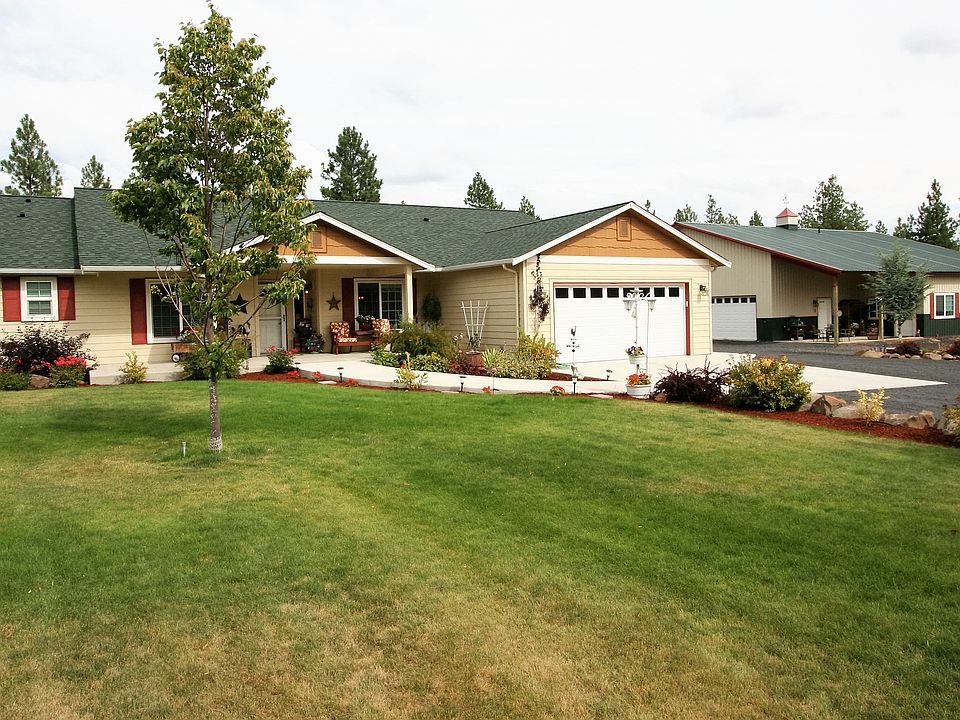 GRAND kitchen with NEW slab-granite counters & tile backsplash, walk-in pantry & custom-lg "built-in" kitchen hutch/buffet. Very open and airy w/cathedral ceilings, new granite in baths, luxurious master w/jet tub & lg walk-in closet w/window. Kitch eat sp plus form din. Big laundry w/sink & storage. 3 bd plus office. 40x60 shop w/14' tall doors-lg stg loft-two 12 ft wide bays. "Complete sep in-law suite" w/ kitch/bath/lndry, RV hookup. Generator ready - runs H2O, all paved access. Borders DNR prop on East.
