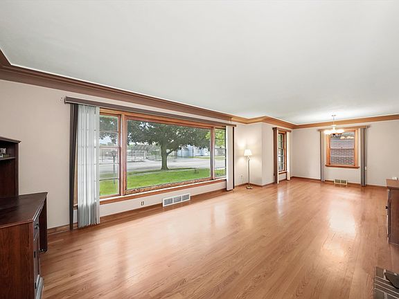 SPRAWLING BRICK 3 BEDROOM/1 BATH RANCH HOME ON A DOUBLE LOT is ready for its next chapter! ~ Handsome all brick exterior vibes mid-century modern, featuring beautiful stone & glass block accents ~ Huge living/dining room boasts lots of natural light, GLEAMING HARDWOOD floors, awesome COVE MOLDING, and beautiful STONE FIREPLACE ~ WHITE-ON-WHITE KITCHEN offers abundant cabinet & counter space, easy PLANK TILE FLOORING, and adjoining BREAKFAST AREA with generous table space ~ All three bedrooms have hardwood flooring, with the primary bedroom carpeted over the hardwood ~ 3rd bedroom is currently used as a den with FRENCH DOORS that open to the kitchen ~ Bathroom features vintage gray & yellow tile ~ FULL BASEMENT (ready for your vision) includes a BATHROOM ROUGH-IN, laundry area, and plenty of storage ~ ENCLOSED BREEZEWAY (fantastic sunroom!) leads to ATTACHED 2.5 CAR GARAGE w/2nd overhead door at rear & 2nd driveway connecting back to alley ~ Fantastic PRIVATE YARD SPACE with beautiful trees, greenery, and stone walkway is perfect for relaxation & entertaining ~ This home is READY & WAITING for you!