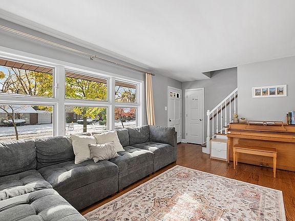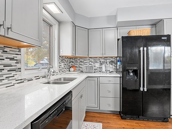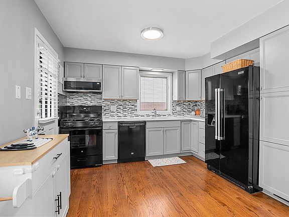 Step into this beautifully updated home where classic charm meets contemporary finishes. The interior has been tastefully painted and features refinished hardwood floors and elegant panel doors throughout, creating a warm and inviting atmosphere. The bright and sunny living room is filled with natural light through multiple windows, perfect for relaxing or entertaining. The eat-in kitchen, remodeled in 2019, boasts updated cabinets, quartz countertops, a stylish tile backsplash, blinds, and new light fixtures added in 2022. Two convenient main-floor bedrooms share a fully remodeled hall bath (2019) with a subway tile shower, new tile flooring, and a modern vanity. Upstairs, two larger bedrooms are complemented by a second fully remodeled bathroom (2019) featuring a tub, subway tile, new vanity, new tile flooring, and updated fixtures. The full finished basement adds even more living space with a family room and recreation room, both outfitted with durable luxury vinyl flooring-perfect for gatherings or relaxing evenings. Large storage space in the laundry/utility room. Outside, enjoy a large fully fenced yard with a concrete patio that backs up to green space, providing both privacy and room for outdoor fun. Recent updates include a new roof installed in 2025 on the home, offering peace of mind for years to come. Move right in and enjoy a home that combines thoughtful updates, functional spaces, and a fantastic layout for family living or entertaining!