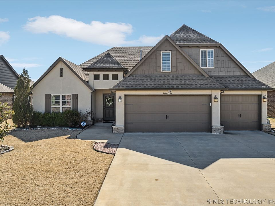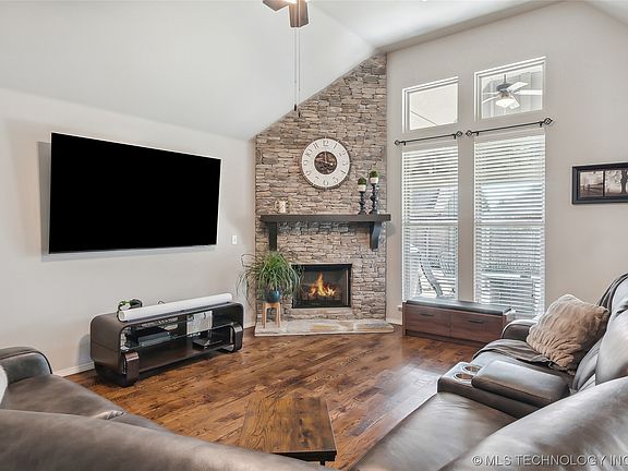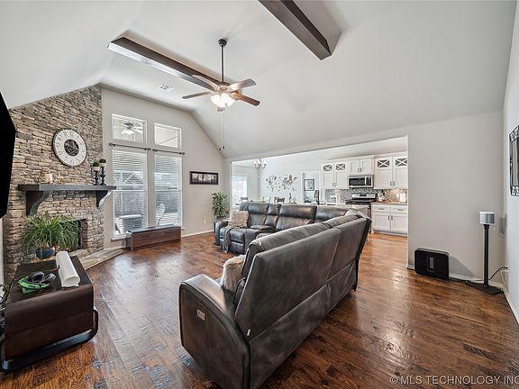Welcome to this stunning, recently-built home! The well-designed layout features hardwood floors, a stacked stone fireplace, and vaulted/beamed ceilings. The open kitchen with beautiful cabinetry and a large island is ideal for hosting gatherings. The home includes a downstairs office/flexroom and an upstairs spacious gameroom, offering ample space to personalize. With a three-car garage featuring a storm shelter, an outdoor covered patio, and pergola, this property is well-equipped. Enjoy the neighborhood amenities, including a pool, pond, and walking trails.