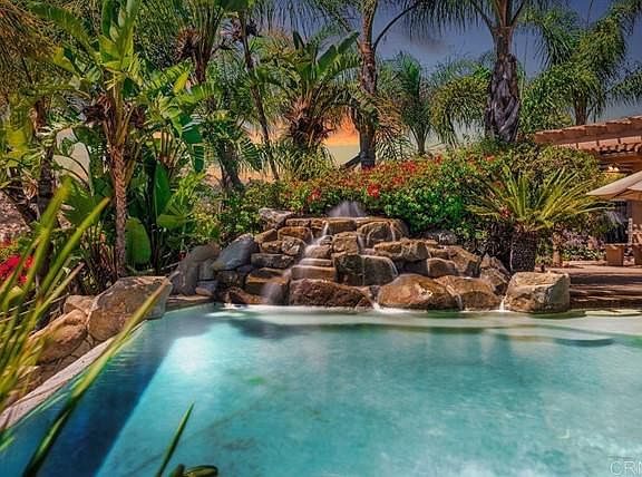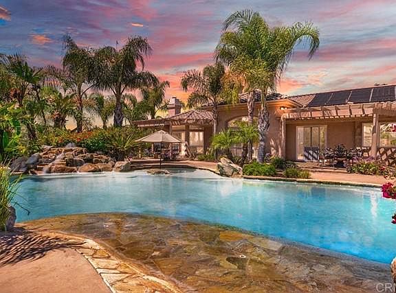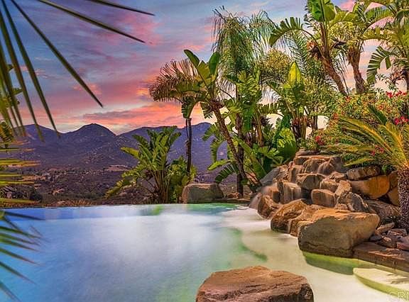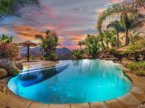 18420 Mahogany Ranch Road, Ramona CA 92065 This 8.60 acre estate features a back yard and grounds that are on par with many resorts. Four bedrooms, three baths, 3,352 square feet, custom built by Freemen Construction in 2004. The expansive pool features vanishing, infinity edge, beach walk in shore, baja shelf and lounge area, intricate custom waterfall, and separate, always ready, jacuzzi spa in a secluded private area. Meandering pathways will take to Palapas, a built in bbq, fire pits, multiple entertainment areas, horseshoe pits and room for a bocce ball court. 44 Solar panel array, dog run, horse corral and room for a shop, barn or ADU. Large double door entry with formal living and dining rooms.The large open concept kitchen and pantry open into the breakfast area and living room. The north side of the home features the master suite, walk in closet, jetted tub and travertine tile and shower. Bonus room can be used as a guest room, office or library and has it's own bathroom that double as the guest bath. The home features numerous architectural details including archways, tray ceilings, quality craftsmanship and custom cabinetry. Two other generous bedrooms are coupled with a joint bathroom. Solid surface granite counters and travertine floors throughout. All windows are dual pane Millgaurd brand. The oversized garage features a double door and a single door with ample space for your toys. To schedule a private showing please call 760.788.SELL(7355)