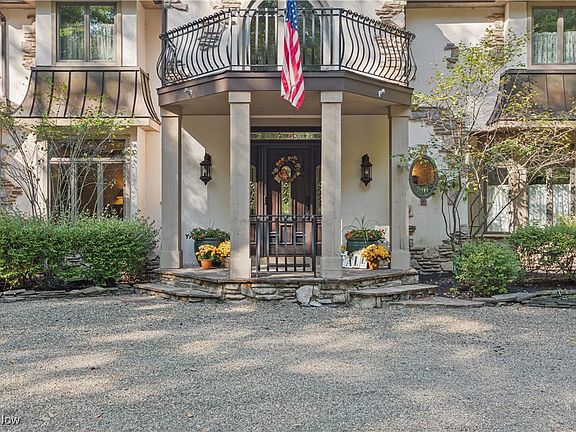 Private location on a 2-acre cul-de-sac overlooking the scenic 23-mile perimeter of the LaDue Reservoir. Stone pillars are the starting point to a long driveway leading to a grand rounded portico entrance w/beautifully crafted wrought iron railing. Open foyer with soaring ceilings, adjacent to a formal dining room featuring a bow window + built-in window seat. Great room w/floor-to-ceiling windows, beamed ceilings, gas fireplace w/mantle and hearth! Great design w/4 bedrooms including 2 owner’s suites + 5 baths. The chef's kitchen showcasing premium cabinetry, high-end appliances, and a professional chef’s sink flows seamlessly into the breakfast area and hearth room w/stone fireplace. Additional living spaces include a cigar porch w/peaked ceilings + tile flooring, detailed office, and a fabulous, functional laundry room with a separate front entrance, barn doors, additional closet space, and a walk-in pantry. The 2nd floor primary suite offers custom stonework and 3rd floor dressing suite (22’x15’)! This private retreat is accessed by a spiral staircase featuring custom built-ins, a walk-in closet, and 2 wardrobe closets. An additional upstairs bedroom includes 2 walk-in closets +full bath. 2nd floor great room, w/skylights + a separate staircase to the kitchen, offers flexible space! The newly finished lower level is styled like a luxury sports bar, w/full wet bar, large rec area, and a full bath. Perfect for friends/family or game-day fun. Amazing outdoor living w/continuous water views + private walkway to the reservoir. Backyard features include a Trex composite deck w/an electronic retractable awning, an expansive patio, a built-in outdoor kitchen, a tranquil pond with a waterfall, an outdoor shower, and a storage shed. The entire property is enhanced by LED landscape lighting, including along the driveway for a dramatic approach to your front door. This one-of-a-kind home combines timeless craftsmanship, luxurious amenities, an opportunity not to be missed.